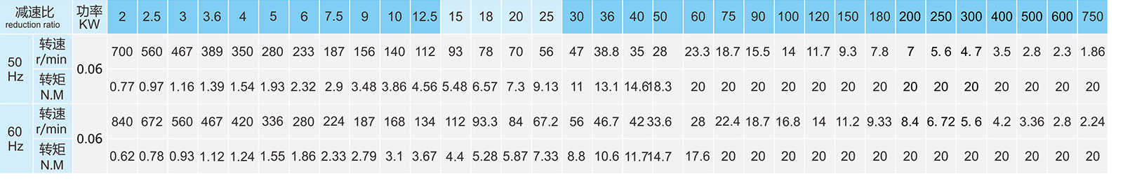 轉(zhuǎn)速是以電動(dòng)機(jī)的異步轉(zhuǎn)速(50Hz:1400r/min、60Hz:1680r/min)為基準(zhǔn)除以減速比而算 出來的數(shù)值。實(shí)際轉(zhuǎn)速將隨負(fù)載大小變化而有所變化。
