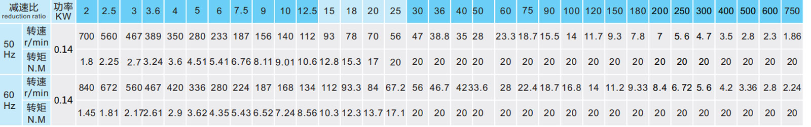 轉(zhuǎn)速是以電動(dòng)機(jī)的異步轉(zhuǎn)速(50Hz:1400r/min、60Hz:1680r/min)為基準(zhǔn)除以減速比而算 出來的數(shù)值。實(shí)際轉(zhuǎn)速將隨負(fù)載大小變化而有所變化。