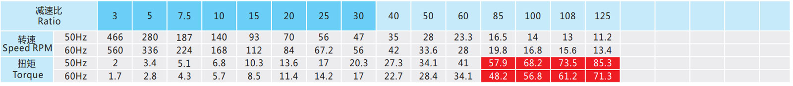 ▲ 表列轉(zhuǎn)速是基于電機(jī)異步轉(zhuǎn)速(50Hz:1400r/min、60Hz:1680r/min),額定負(fù)載時(shí),實(shí)際轉(zhuǎn)速為表列轉(zhuǎn)速的80%-98%。