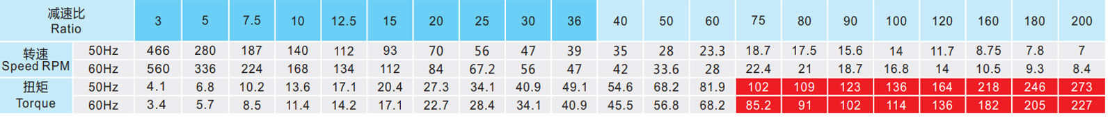 ▲ 表列轉(zhuǎn)速是基于電機(jī)異步轉(zhuǎn)速(50Hz:1400r/min、60Hz:1680r/min),額定負(fù)載時(shí),實(shí)際轉(zhuǎn)速為表列轉(zhuǎn)速的80%-98%。