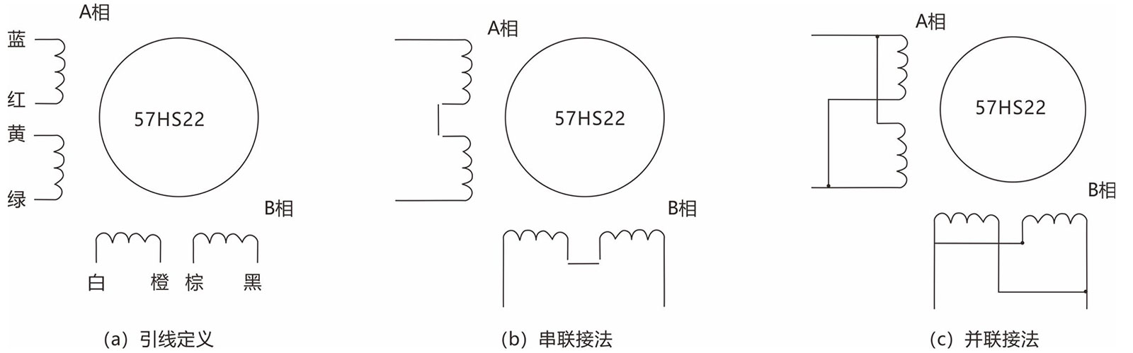 2)相是相對的,但不同相的繞組不能接在驅(qū)動器同一相的端子上(A+、A-為一相,B+、B-為另一相),57HS22電機引線定義、串、并聯(lián)接法如下圖所示。