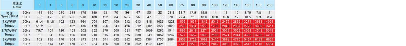 ▲ 表列轉(zhuǎn)速是基于電機異步轉(zhuǎn)速(50Hz:1400r/min、60Hz:1680r/min),額定負(fù)載時,實際轉(zhuǎn)速為表列轉(zhuǎn)速的80%-98%。